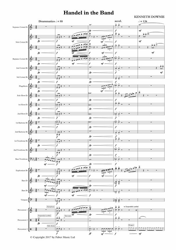 Handel in the Band (Partituur Brassband). Handel in the Band is a virtuoso set of symphonic variations on one of Handel’s best known keyboard dances, the Sarabande from his Suite in D minor, HWV 437, based on the Spanish traditional dance La Folia. Kenneth Downie’s work was commissioned by Brass Band Treize Etoiles, for performance at the 2013 Swiss National Brass Band Championships, where it was conducted by James Gourlay. The title is a reference to Percy Grainger’s popular Handel in the Strand, and is indicative of the witty and theatrical nature of the music, which is more playful than conventional competition pieces and as such offers different challenges to brass bands as well as being thoroughly entertaining for audiences. Kenneth Downie is one of the most respected and experienced brass band composers. His music has been widely performed and published throughout the brass band world since the 1960s.